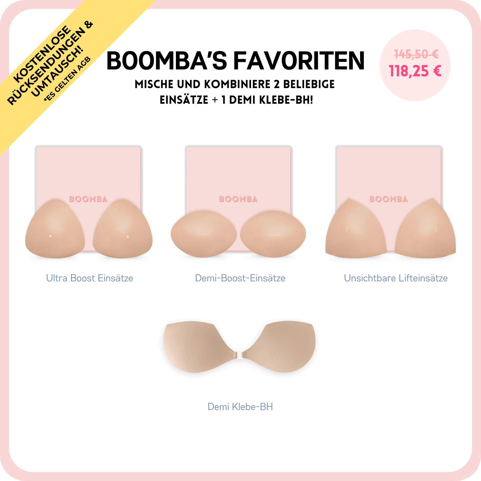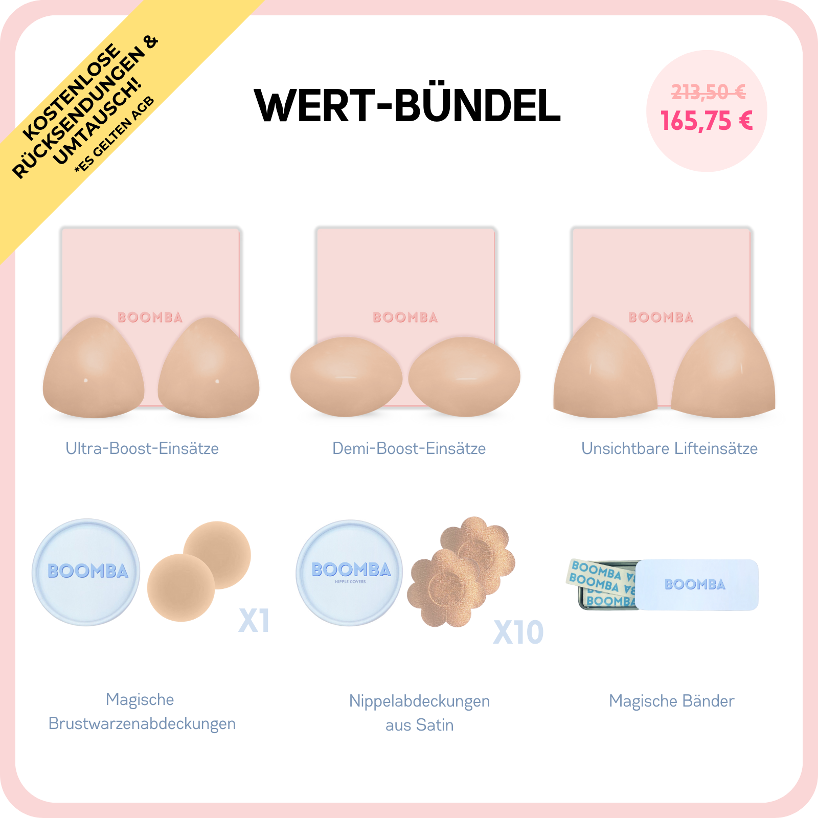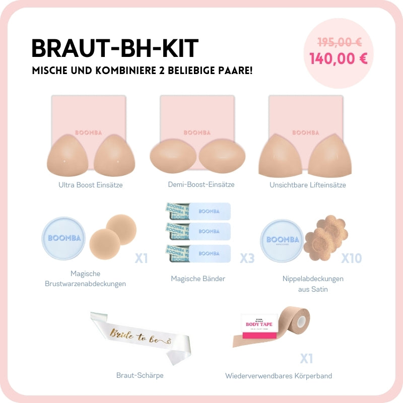Die BOOMBA-Einsätze sind einzigartig gepolsterte Einlagen, die ein sofortiges Lifting erzeugen und in Sekundenschnelle bis zu 2 Körbchengrößen hinzufügen. Sie geben dir dieses wunderschöne Dekolleté in Sekunden!
