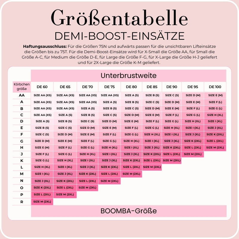 Für die Demi-Boost-Einsätze wird für Extra-Small die Größe AA versandt. Für die Größen A, B und C wird die Größe Small versandt. Für die Größen D und E wird die Größe Medium versandt. Für die Größen F und G wird die Größe Large versandt. Für die Größen H, I und J wird die Größe Extra-Large versandt, und für die Größen K, L und M wird die Größe 2Extra-Large versandt.