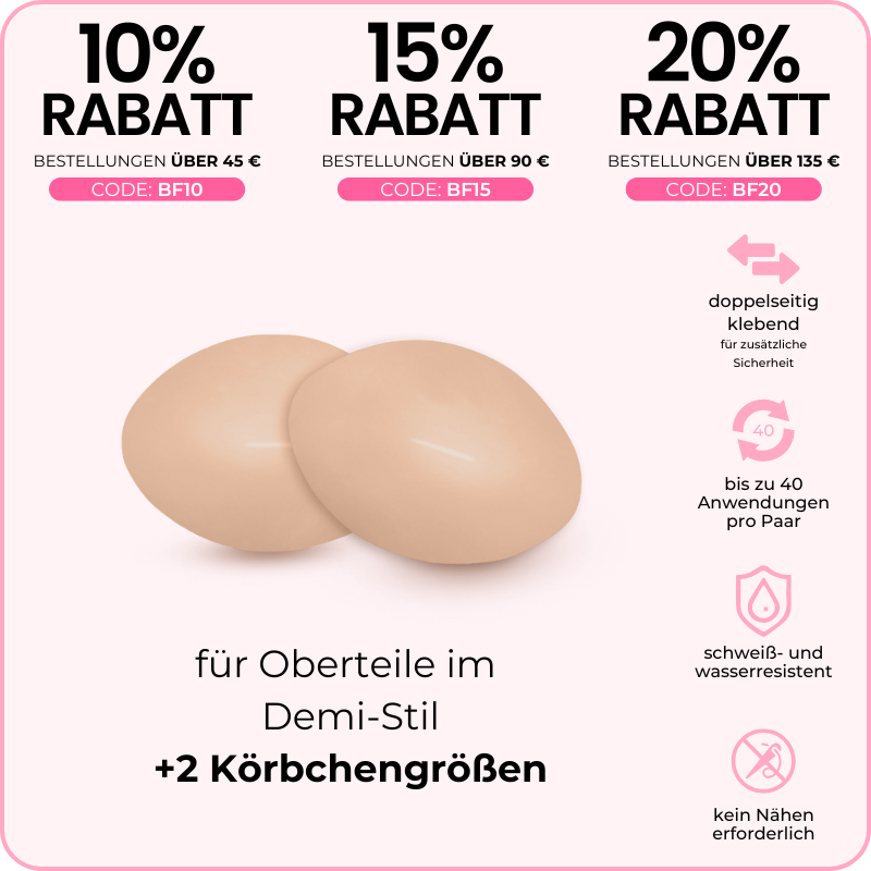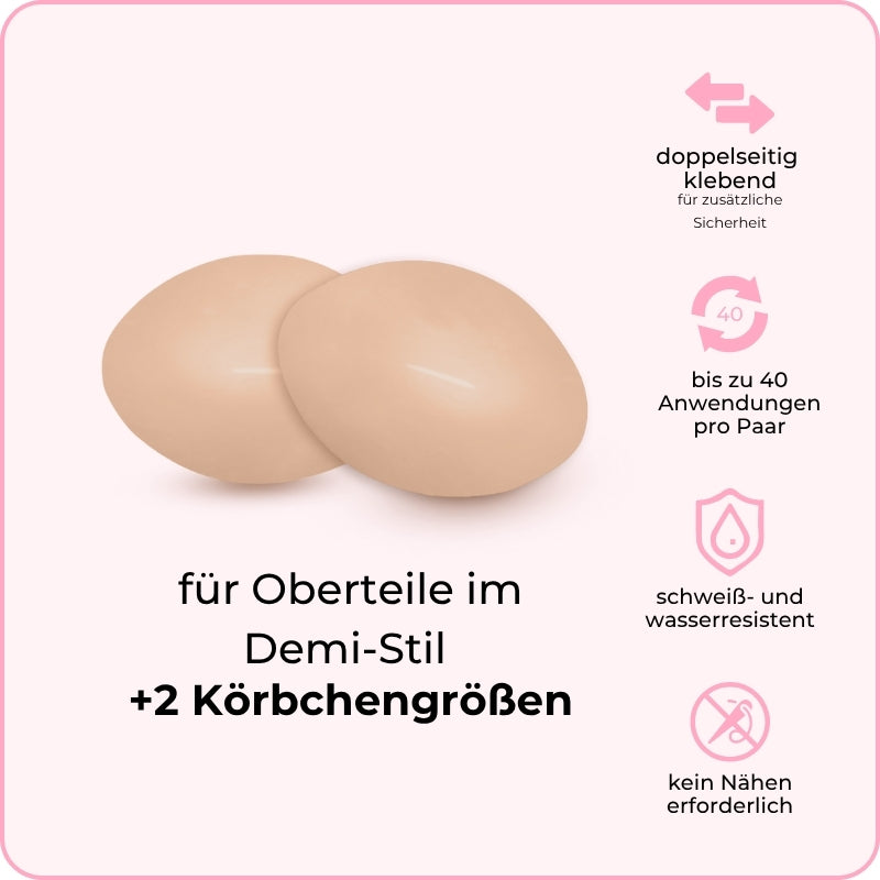 Demi-Boost-Einsätze: die verkürzte Version unserer Ultra Boost Einsätze, liften und fügen 2 Körbchengrößen hinzu, perfekt für Dekolletés mit Sweetheart-Ausschnitt.