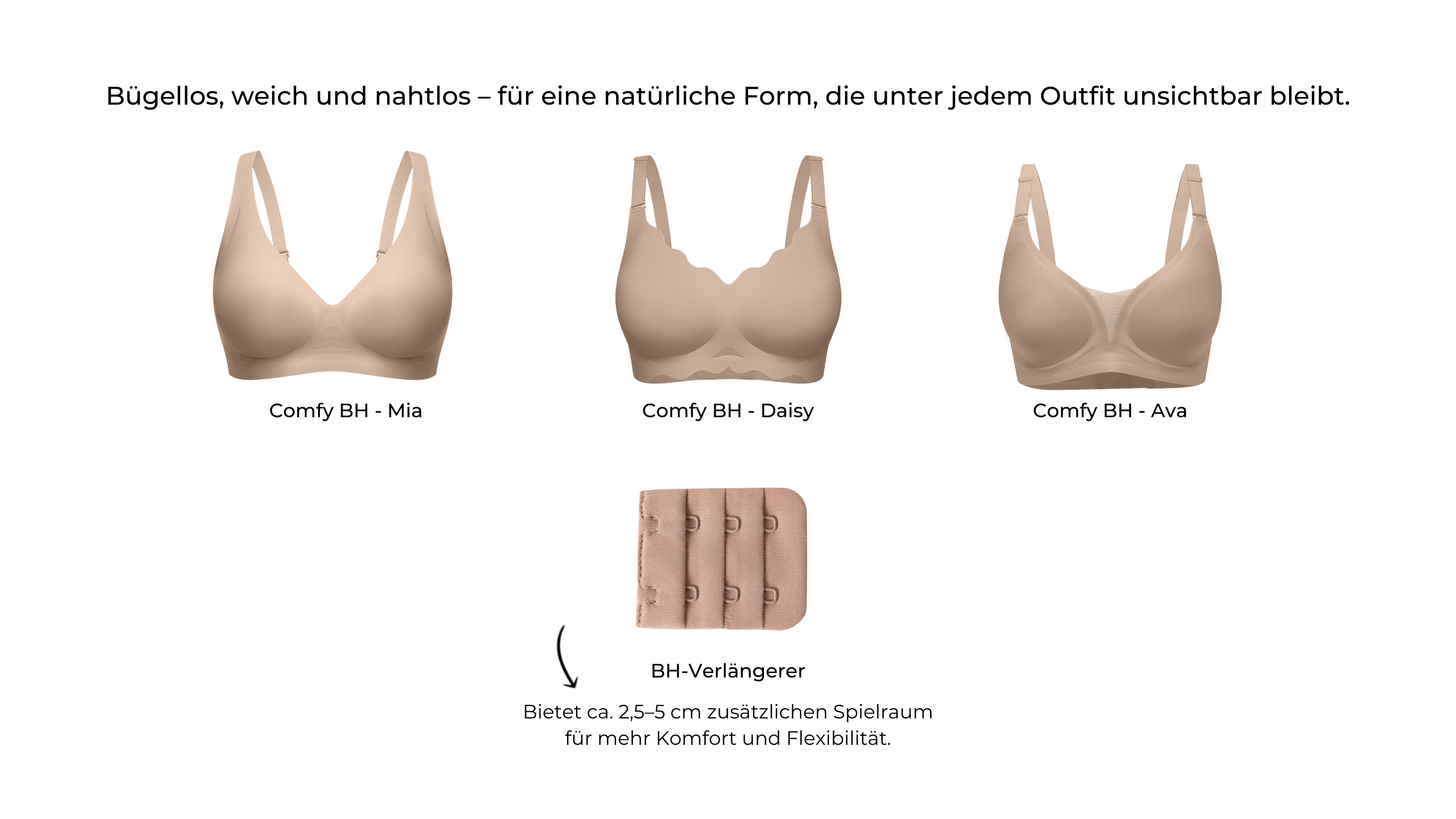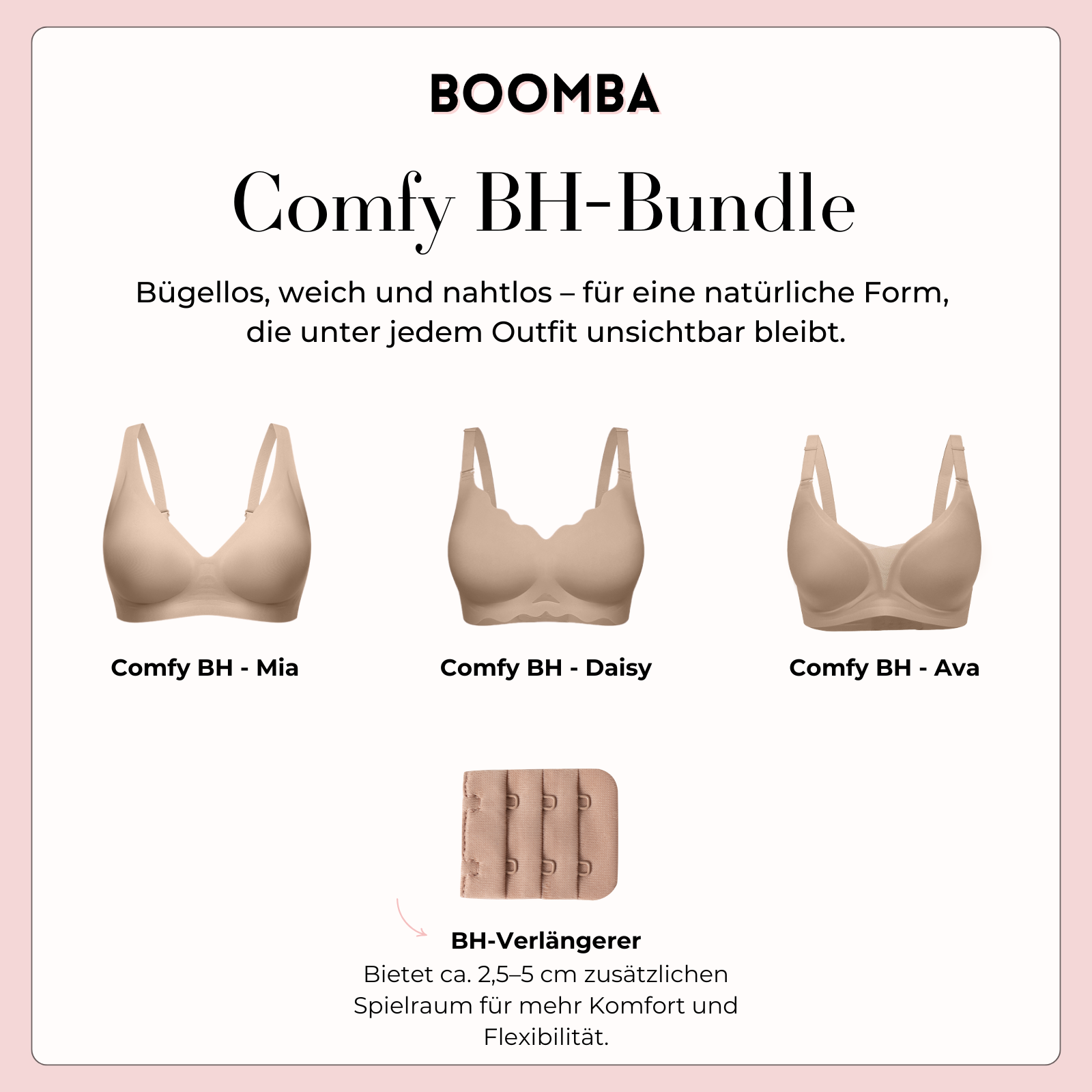 Entdecke deine ultimative Komfort-Kollektion: das BOOMBA Comfy Bra Bundle. Dieses Set enthält drei unserer beliebtesten bügellosen BHs – für maximalen Komfort, den ganzen Tag.