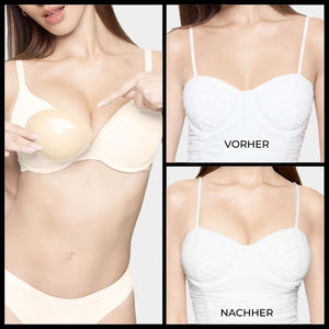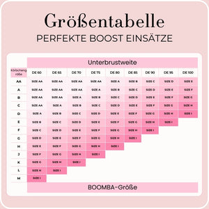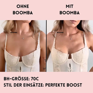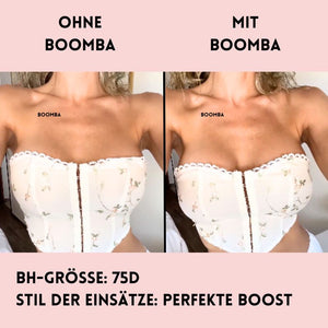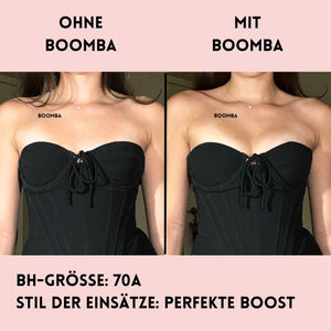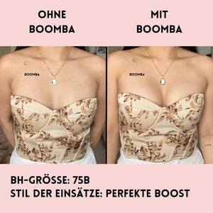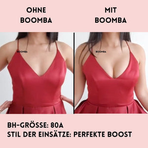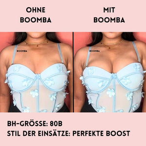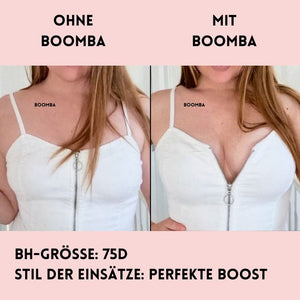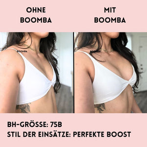 Hinweis: Die Ergebnisse können je nach Brustgröße und -form variieren. Die Ergebnisse sind ähnlich wie bei einem doppelten Push-up-BH. Die gepolsterten Einsätze von BOOMBA funktionieren am besten bei natürlichen Brüsten.