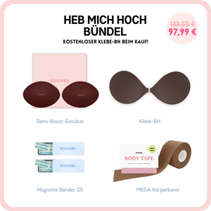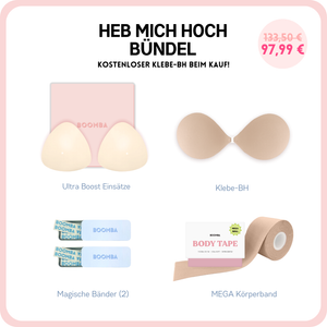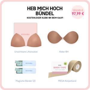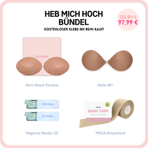 Im Gegensatz zu einem Klebe-BH, der durch das Klebeband gehalten wird, werden die BOOMBA-Einsätze von der Kleidung gehalten. Es ist wichtig, dass du enge, anliegende Oberteile trägst.
