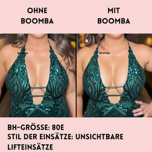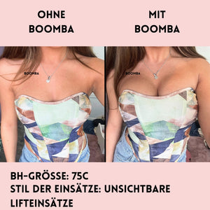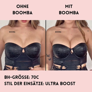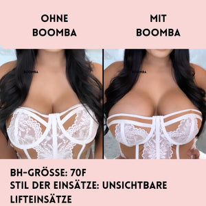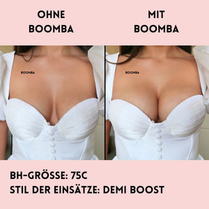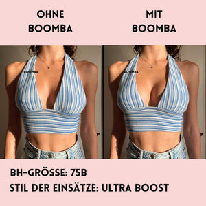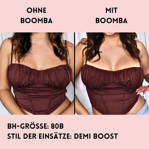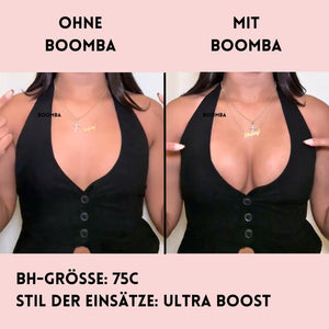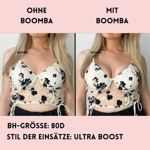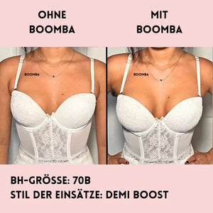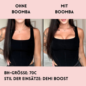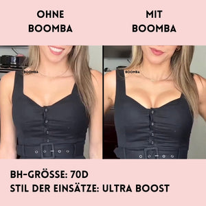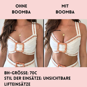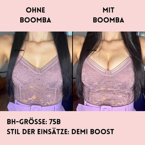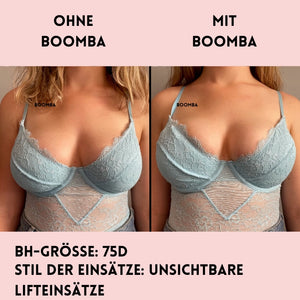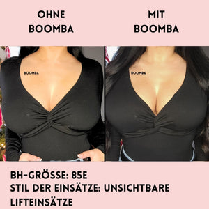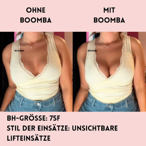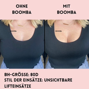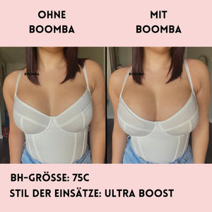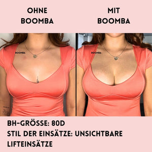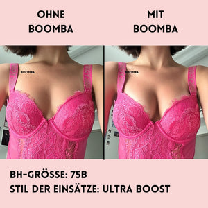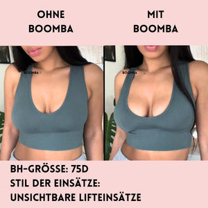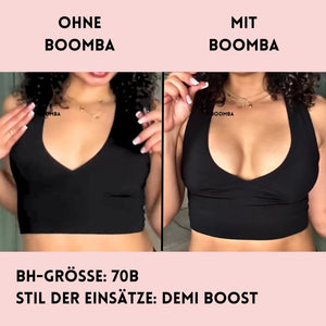 Hinweis: Die Ergebnisse können je nach Brustgröße und -form variieren. Die Ergebnisse sind ähnlich wie bei einem doppelten Push-up-BH. Die gepolsterten BOOMBA-Einsätze funktionieren am besten bei natürlichen Brüsten.