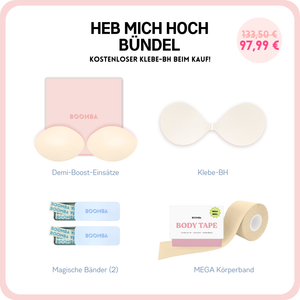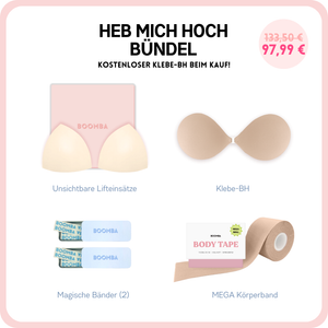 Falls du auf der Suche nach etwas mehr Dekolleté bist oder deinem Outfit einfach mehr Stil verleihen möchtest, dann ist dieses Paket perfekt für dich. Dieses Paket enthält 1 Paar Einsätze, 1 Klebe-BH, 2 Dosen Magische Bänder und 1 Mega Körperband. Mit diesem Paket erhältst du ein natürliches Lifting und Volumen.