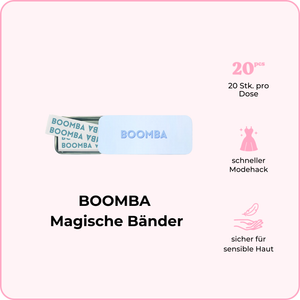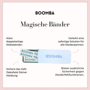 Die magischen Bänder von BOOMBA sind ein durchsichtiger Klebestreifen, der sich für zusätzliche Sicherheit diskret unter deiner Kleidung verbirgt. Wage selbstbewusst den Sprung: einfach abziehen, aufkleben und los!