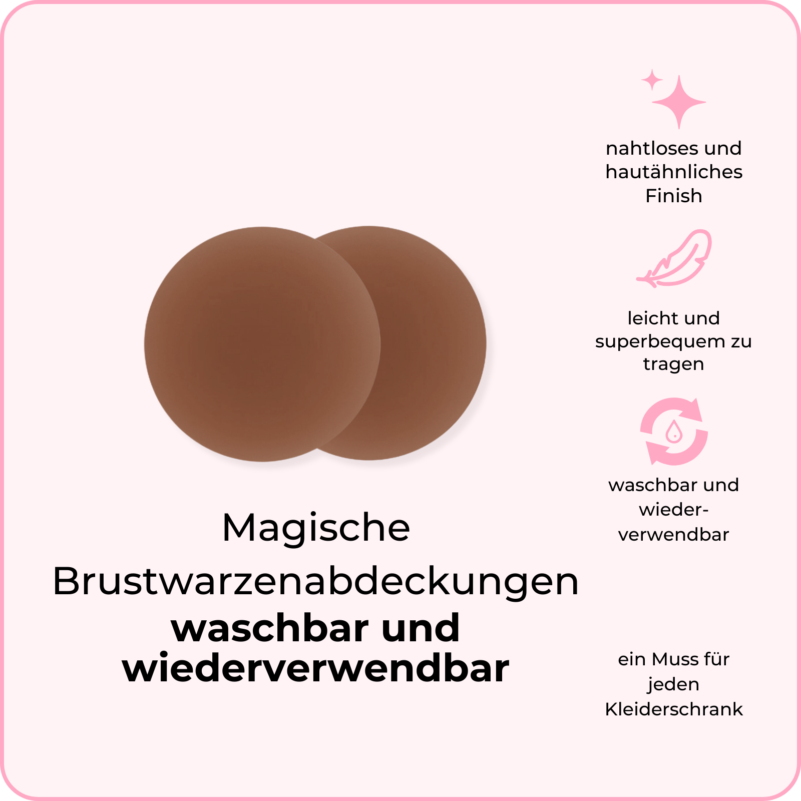 Du willst zusätzliche Sicherheit? Wir bieten unsere magischen Brustwarzenabdeckungen (Kleber) auch mit einer dünnen Klebeschicht an. Diese magischen Brustwarzenabdeckungen sind waschbar und wiederverwendbar, sodass sie immer wieder verwendet werden können.