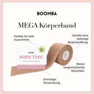 BOOMBAs Mega Körperband kann in verschiedenen Möglichkeiten getragen werden. Es ist so konzipiert, dass es deiner Figur folgt, und ist deshalb sowohl zart als auch beständig, um dauerhafte Ergebnisse von bis zu 12 Stunden zu verschaffen.