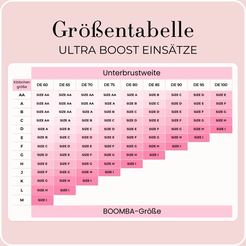 Hinweis: Die Ergebnisse können je nach Brustgröße und -form variieren. Die Ergebnisse sind ähnlich wie bei einem doppelten Push-up-BH. Die gepolsterten Einsätze von BOOMBA funktionieren am besten bei natürlichen Brüsten.