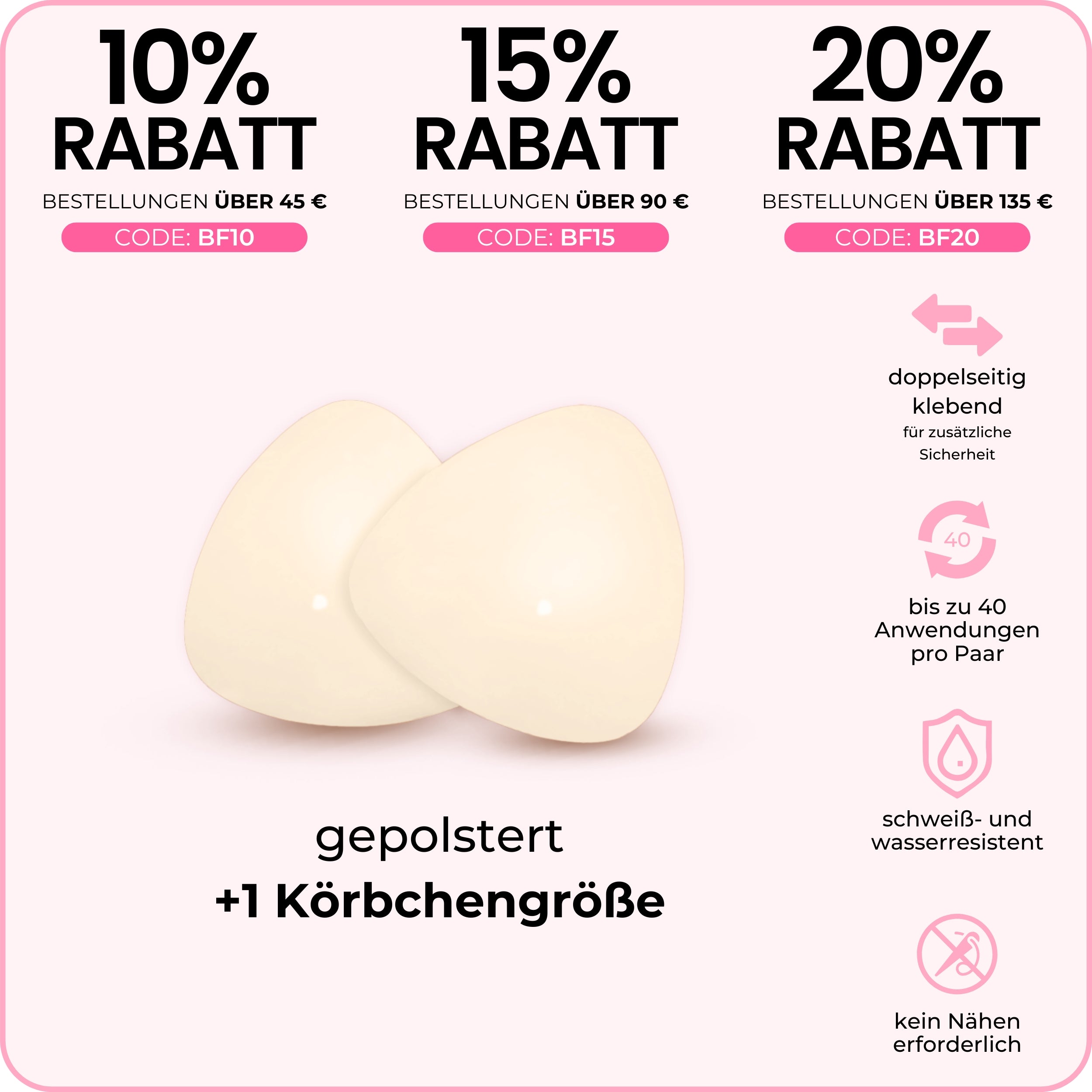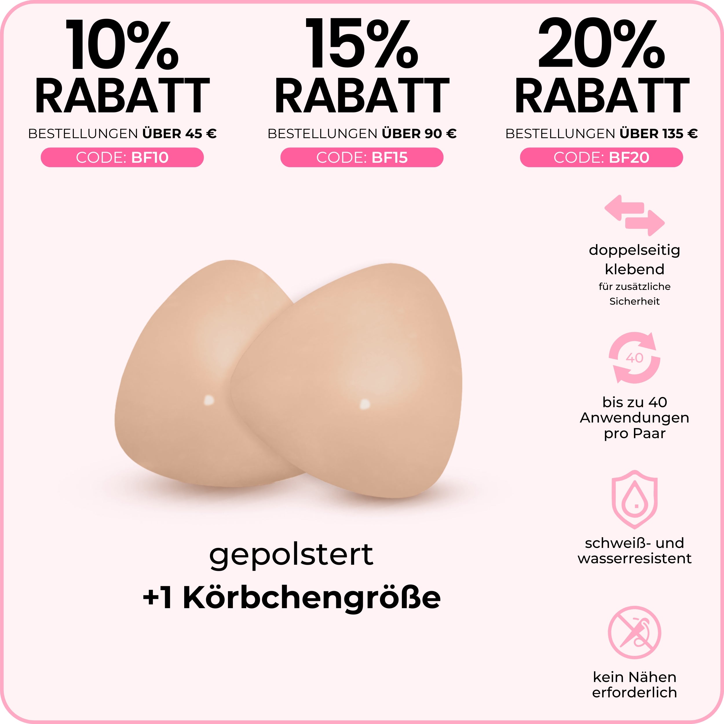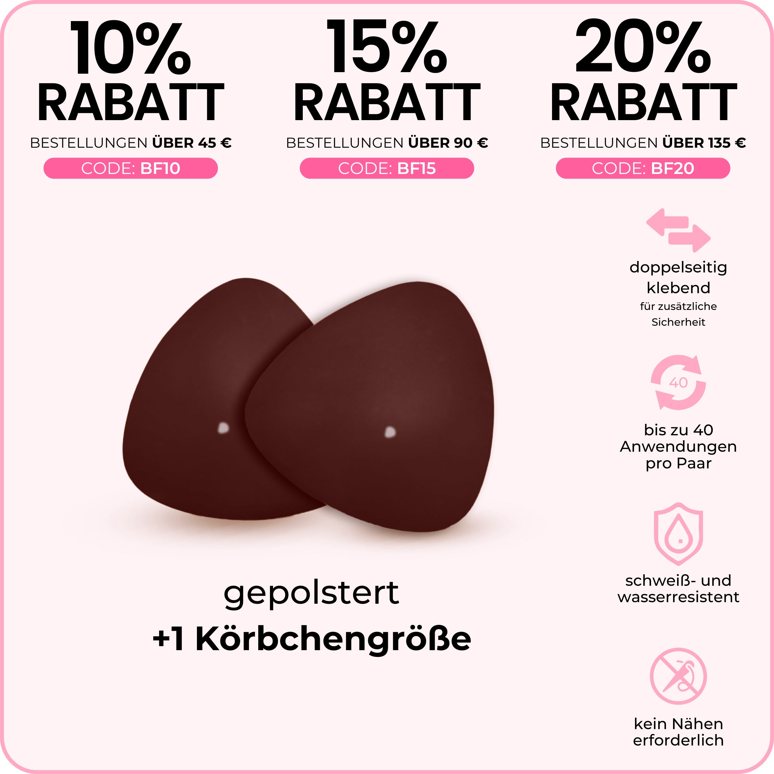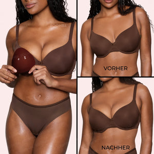 Unsichtbare Lifteinsätze: leicht gepolstert, liften und formen, ohne die Größe bei tief ausgeschnittenen Oberteilen und Triangel-Bikinis zu betonen.