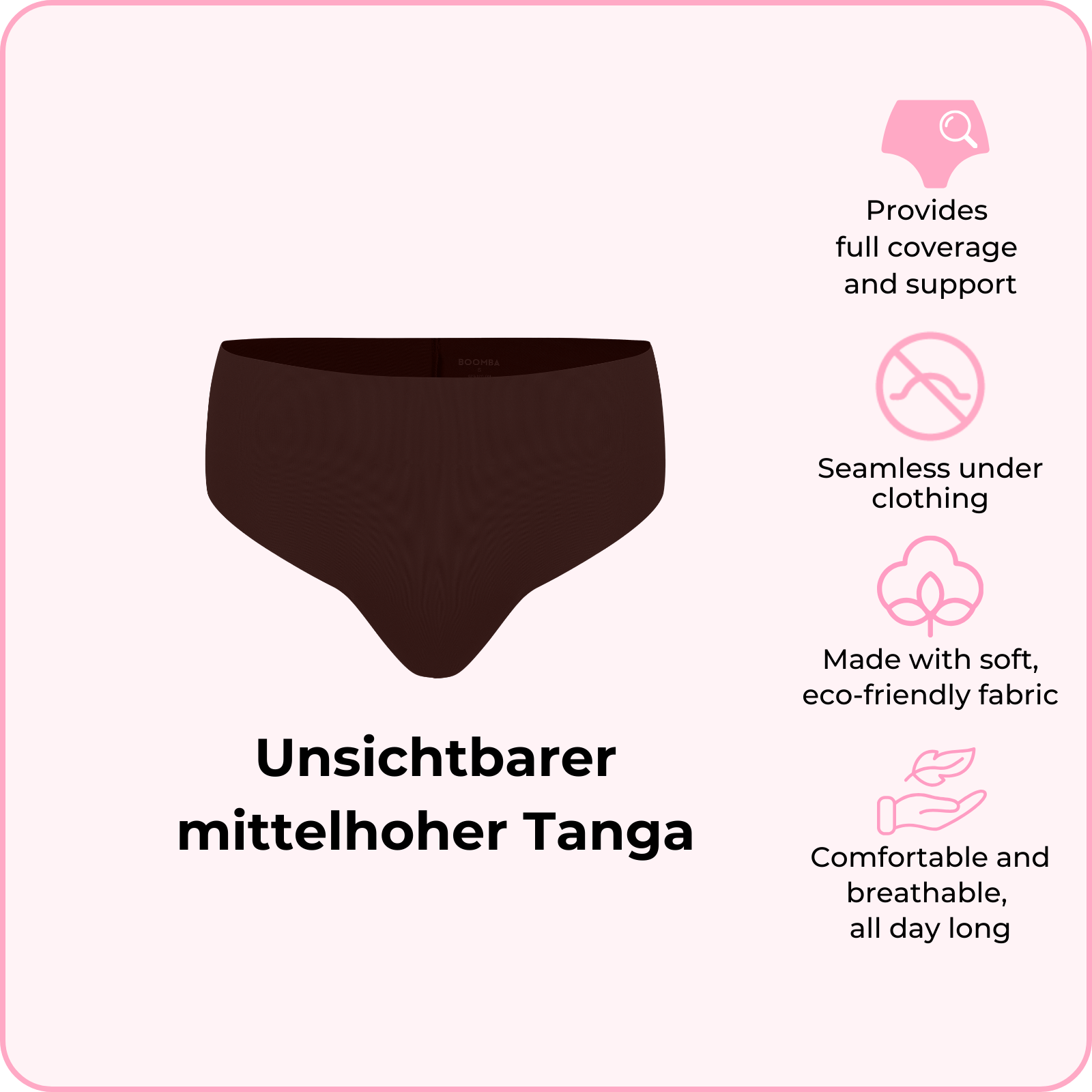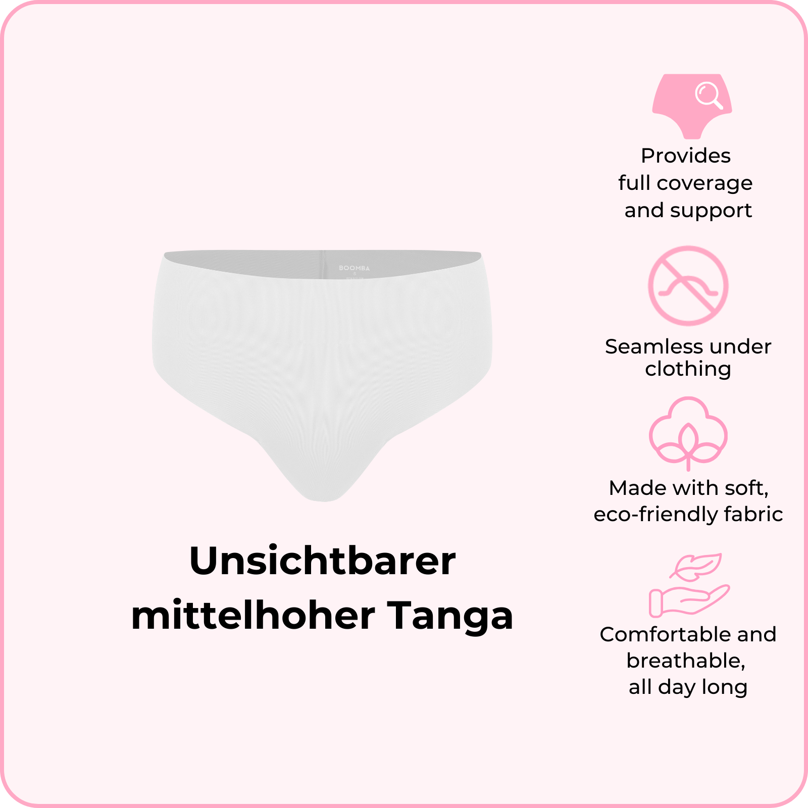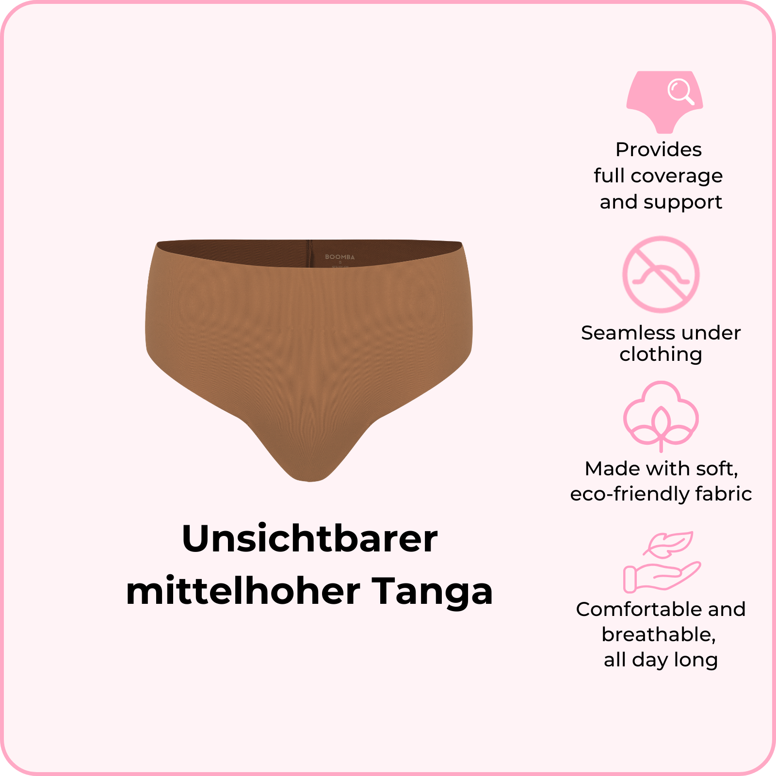 Entdecke den BOOMBA Unsichtbarer mittelhoher Tanga – wie eine zweite Haut, nur viel stylischer! Aus ultraweichem, nahtlosem Material gefertigt, bietet er dir den ganzen Tag Komfort und bleibt unsichtbar unter der Kleidung. Der Mid-Rise-Schnitt vereint die perfekte Mischung aus Abdeckung und Stil, ideal für jeden Tag.