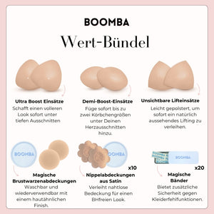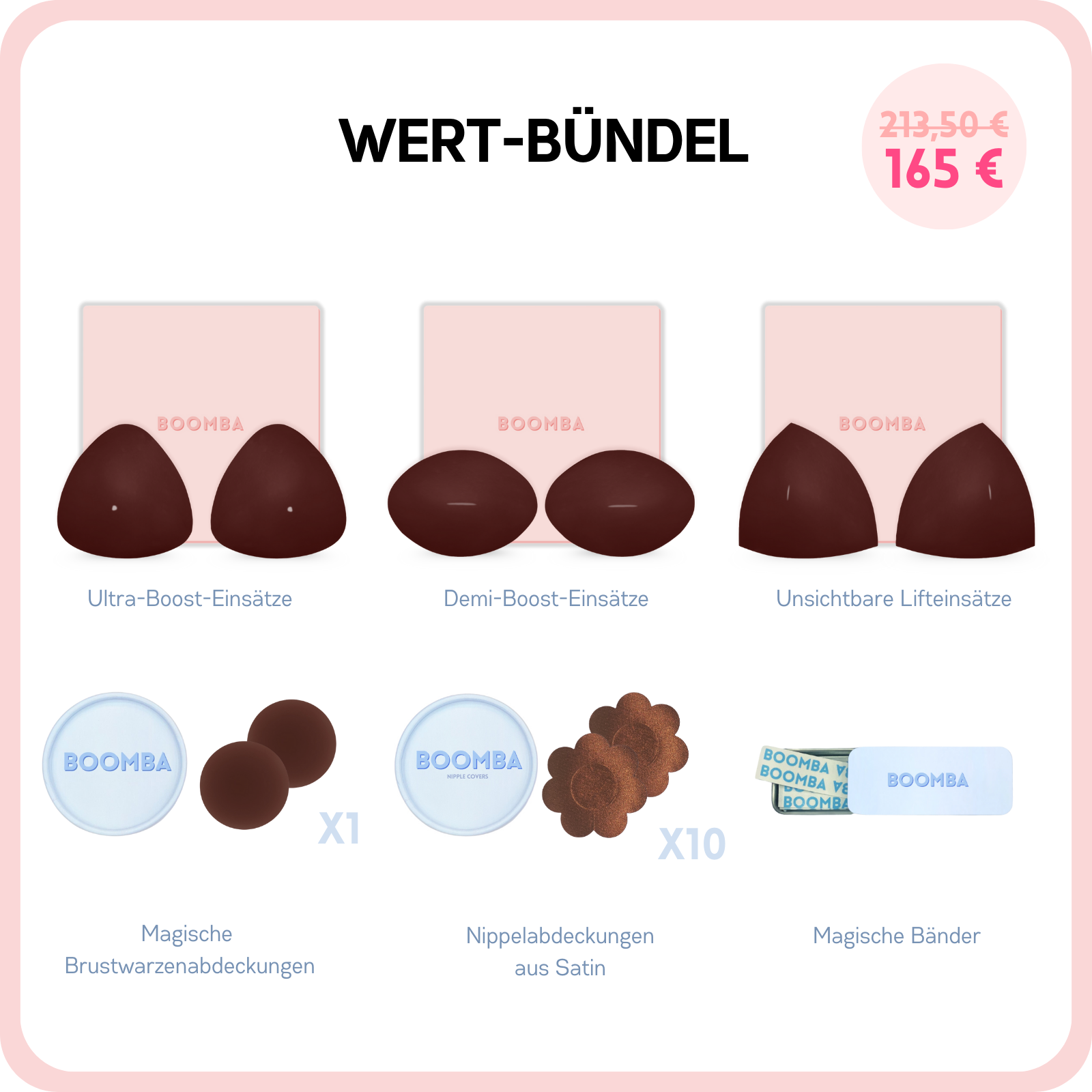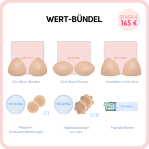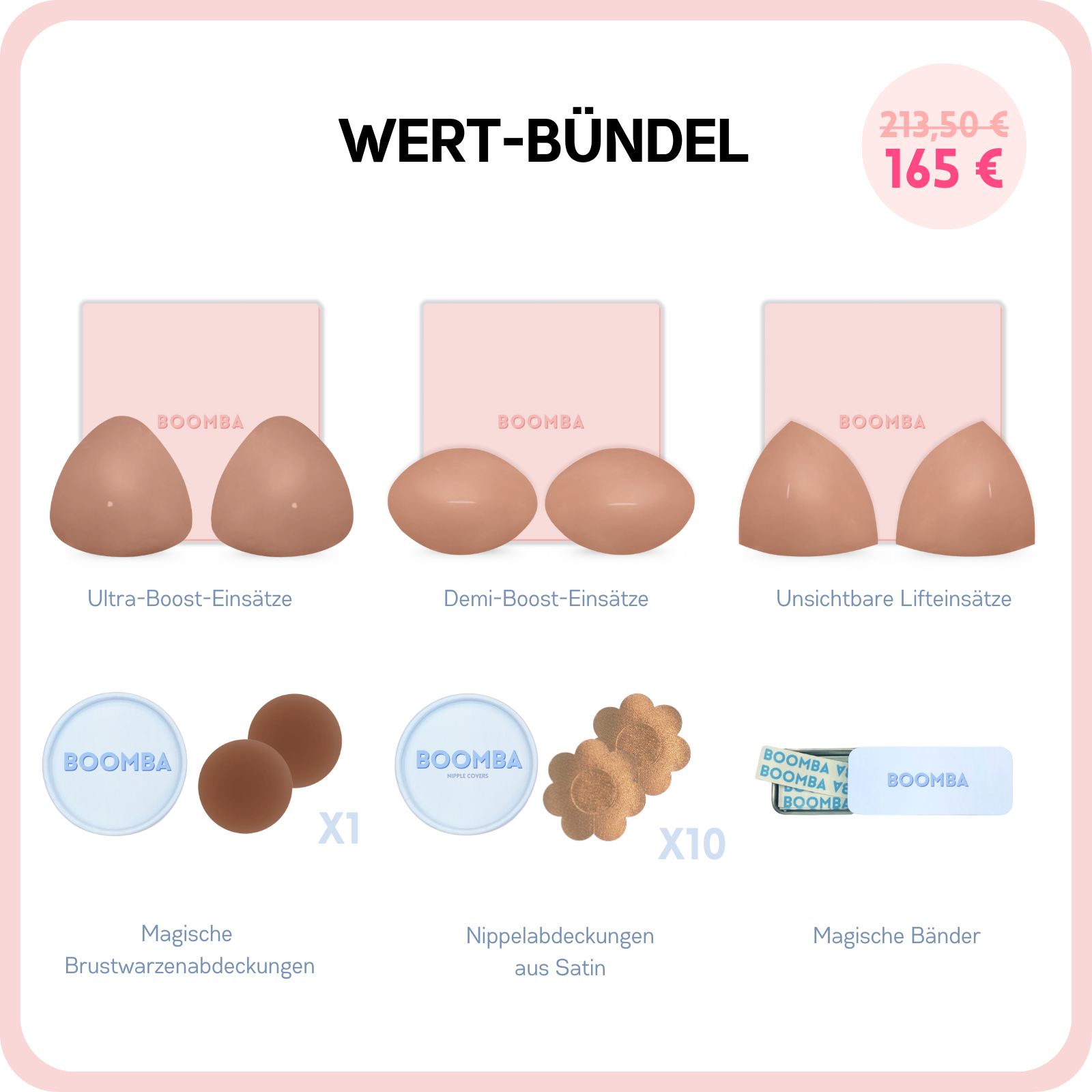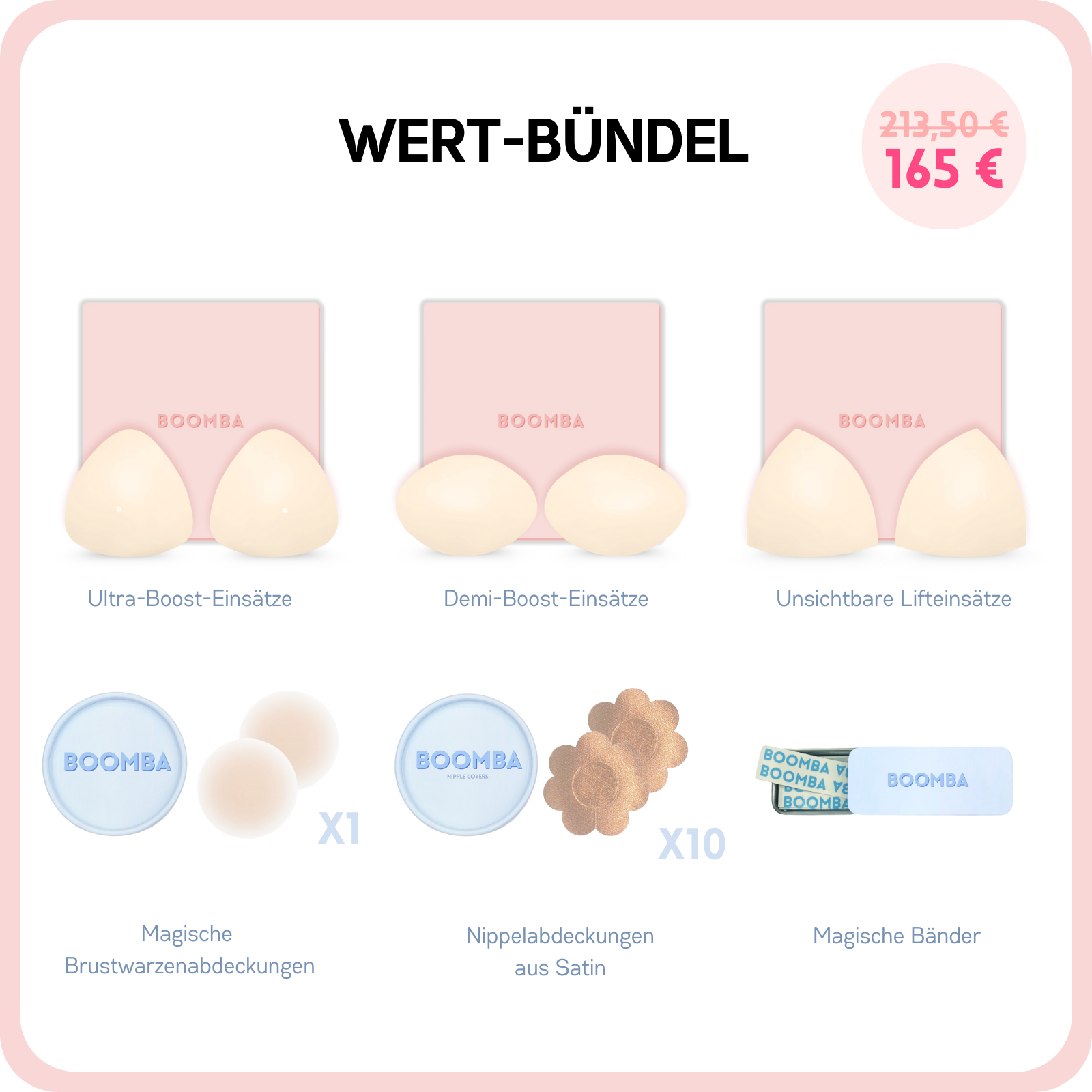 Dieses Paket enthält alle drei Stile unserer beliebten Einsätze: 1 Paar Ultra Boost Einsätze, 1 Paar Demi-Boost-Einsätze und 1 Paar unsichtbare Lifteinsätze. Es enthält auch unsere meistverkauften magischen Brustwarzenabdeckungen (klebend), Brustwarzenabdeckungen aus Satin und Magische Bänder.