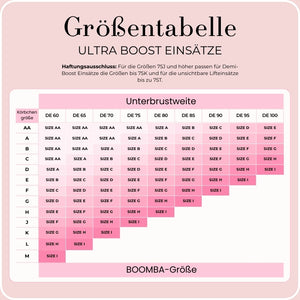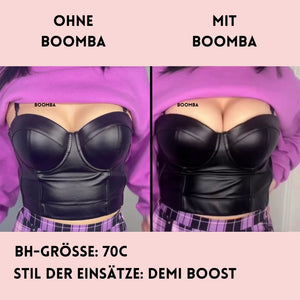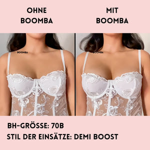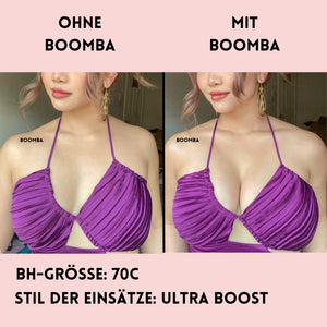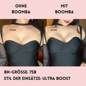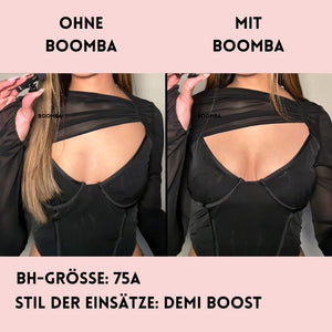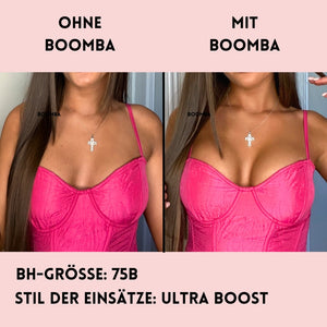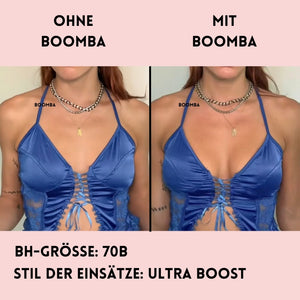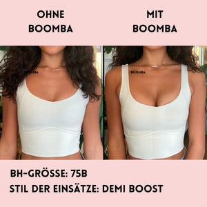 Hinweis: Die Ergebnisse können je nach Brustgröße und -form variieren. Die Ergebnisse sind ähnlich wie bei einem doppelten Push-up-BH. Die gepolsterten Einsätze von BOOMBA funktionieren am besten bei natürlichen Brüsten.