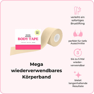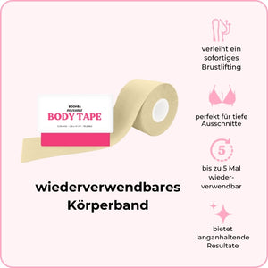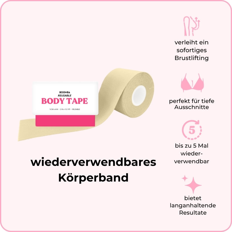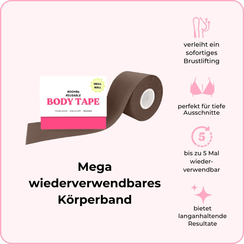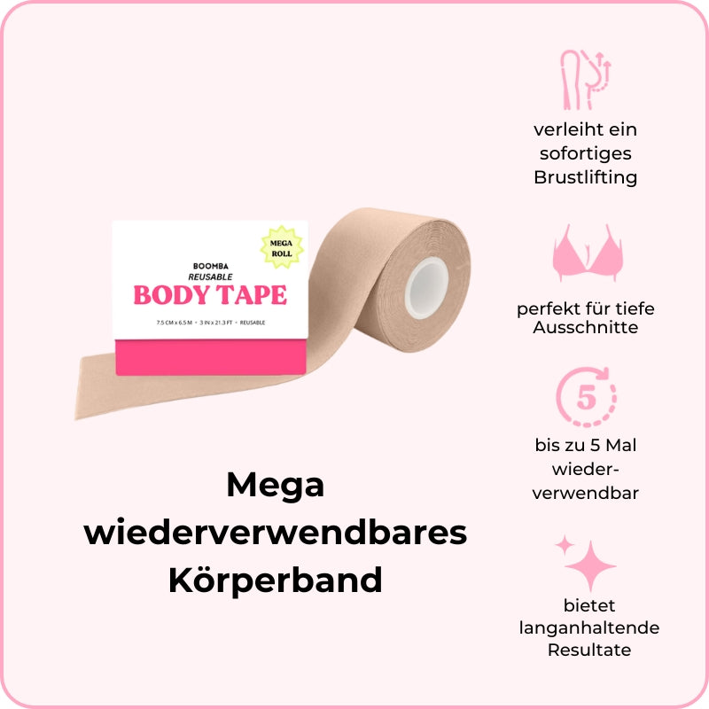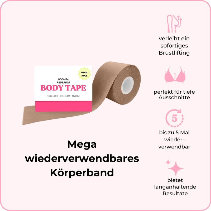 BOOMBAs wiederverwendbares Körperband kann bis zu 5 Mal wiederverwendet werden. Unser Körperband wurde entwickelt, um sich deiner Form anzupassen. Es ist sanft, aber dennoch stark und liefert langanhaltende Ergebnisse von bis zu 12 Stunden.